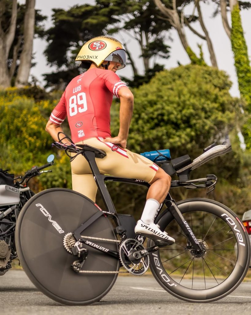 Luis hizo una incluso una gran presentación al empezar la prueba para conseguir llevarse el apoyo de la afición local mientras competía en las T100 de San Francisco y que mejor manera de hacerlo que vistiendo como un jugador del equipo local de fútbol americano. El traje de triatlón era idéntico al utilizado por el equipo de la NFL, con los mismo colores y características, con los icónicos pantalones y casco dorados del equipo.