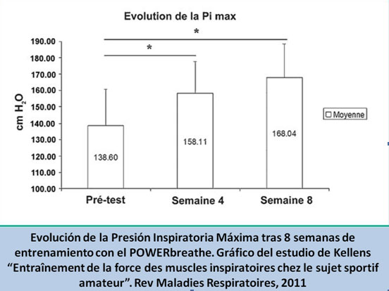 Kellens y col han publicado el estudio realizado en la revista “Revue des Maladies Respiratoires”, bajo el título “Entraînement de la force des muscles inspiratoires chez le sujet sportif amateur” y en sus Conclusiones refieren que un entrenamiento específico mediante el POWERbreathe durante 8 semanas, mejora de forma significativa la fuerza de los músculos inspiratorios de sujetos sanos.